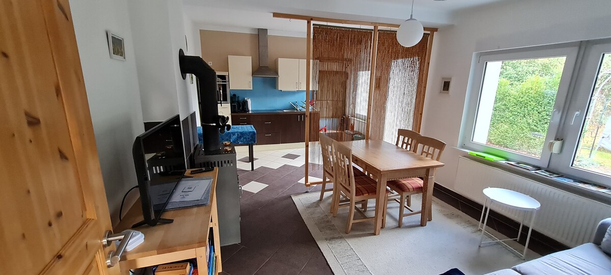 Lägenheten ligger i en gammal bondgård som renoverades med stil 2023 i naturreservatet Schorfheide, och ligger bara 2 minuters promenad från sjön, du kan bada lugnt och avkopplat. Till huset hör en roddbåt, som kan användas mot en avgift (10 €/dag). Från den stora uteterrassen kan du se tranor och storkar på ängen som hör till gården. Chorin-klostret och ekobyn Brodowin kan nås med bil på 15 minuter (cykel 30 minuter).