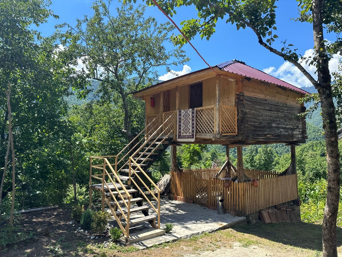 Stugan ligger i ett fantastiskt läge i byn Itsa, omgiven av gröna, trädbevuxna kullar och med utsikt mot de majestätiska Kaukasusbergen. Den vackra floden Krikhula ligger också i närheten och väntar på att upptäckas