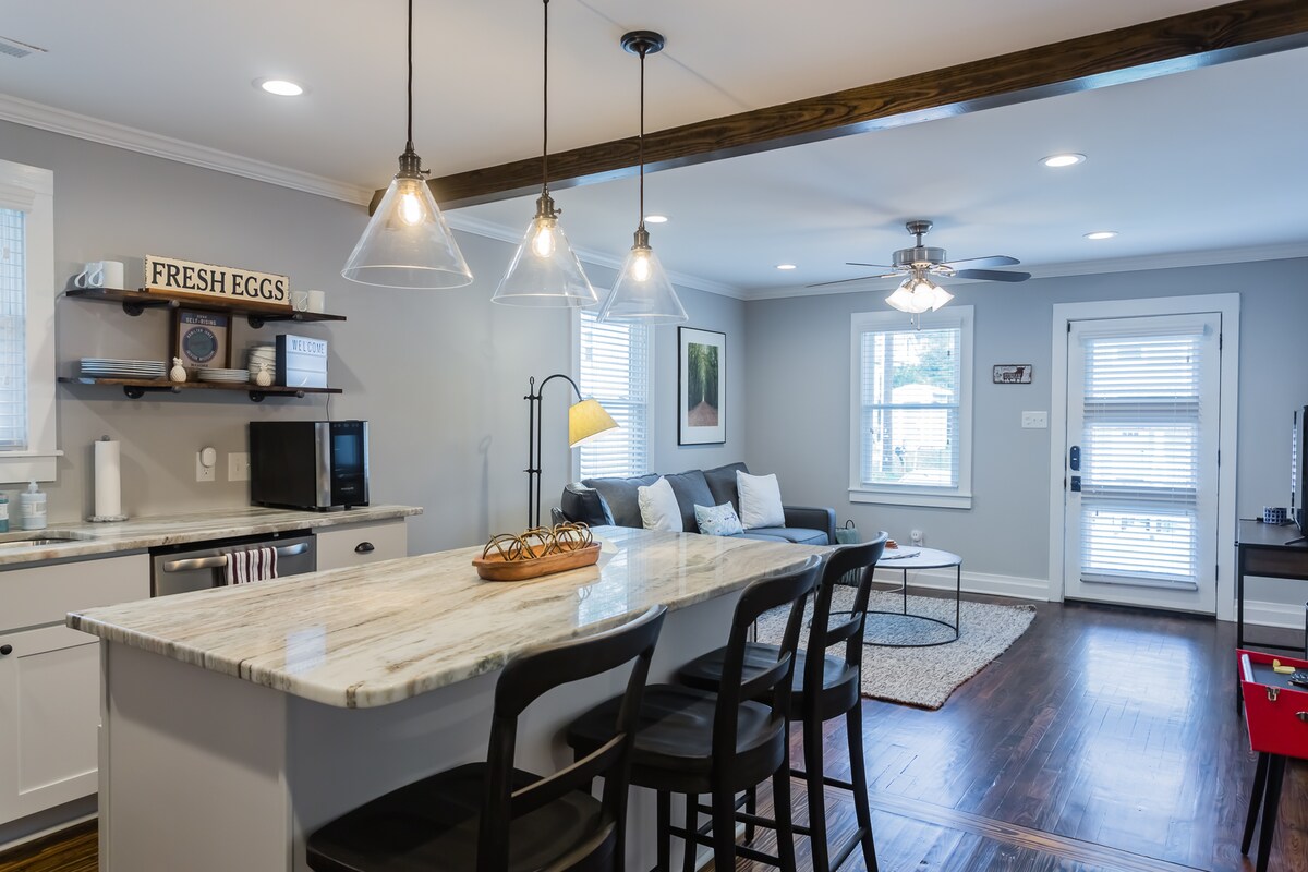 Ett elegant, modernt och vackert gästhus i en gränd som ligger bara 2 kvarter från Duke's East Campus och 4 kvarter från centrala Durham. Lägenheten ligger i det historiska Trinity Park Neighborhood i Durham. Lägenheten har en toppfinish, trägolv, vitvaror och möbler. Loftområdet är utrustat med ett stående skrivbord och bildskärm och 2 yogamattor, och det är idealiskt för arbetande proffs som besöker området. Byggt: 2023