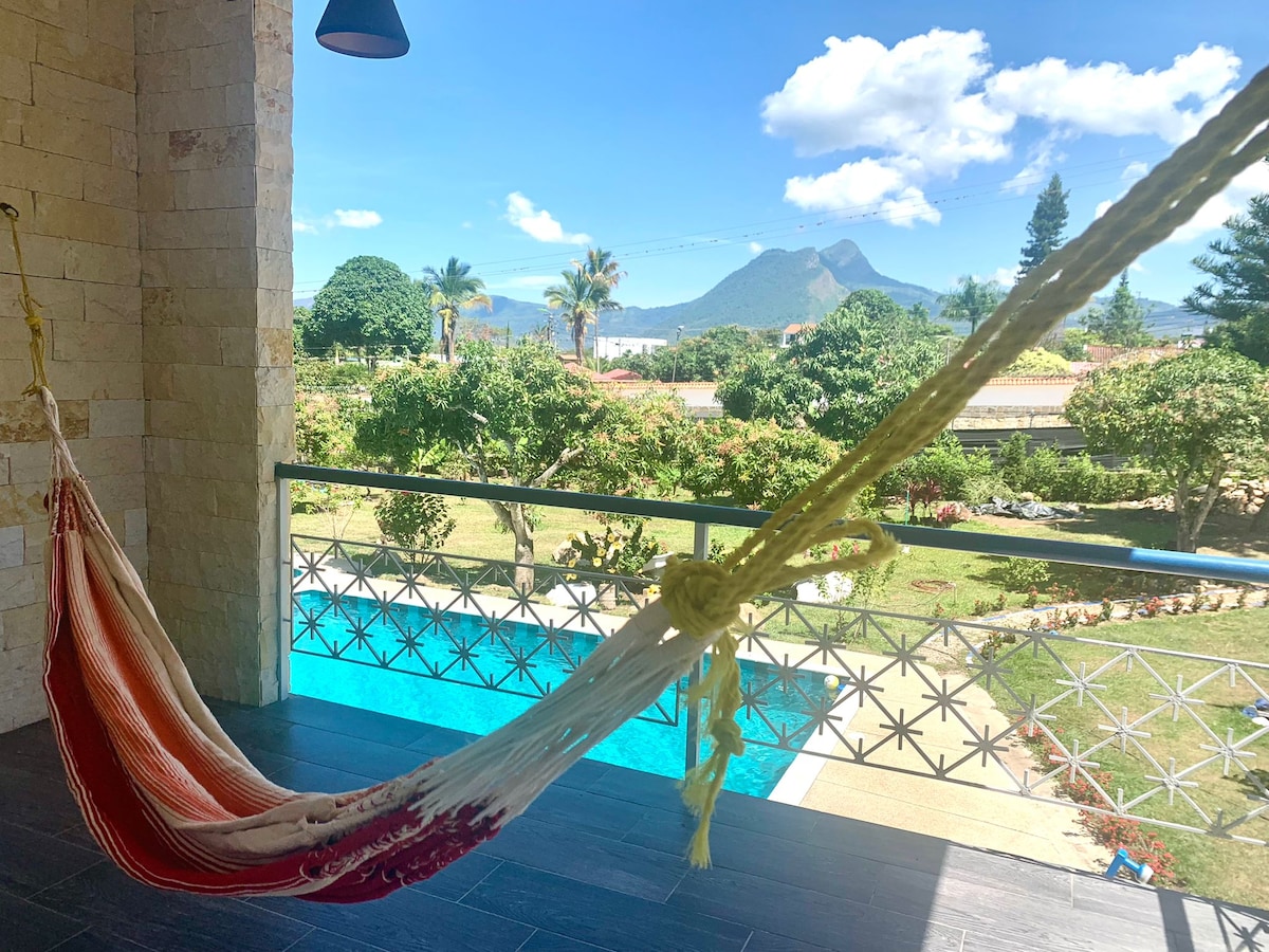 Du kommer att ha hela värdshuset för dig själv, det är helt privat. Priset är för en stuga per natt för maximalt 5 personer MEN OM NI VILL VARA FLER PERSONER SKRIV TILL MIG DET FINNS FLER ALTERNATIV FÖR STUGSERVICE På denna plats kan du laga mat med familjen. Terrassen är underbar där du kan beundra en vacker utsikt över bergen. Den är omgiven av kolibrifåglar och mycket natur. Vi väntar på dig!!