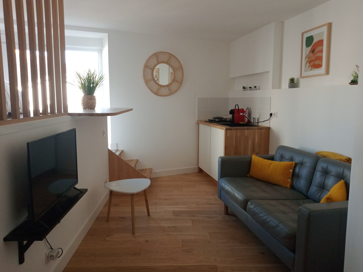 Välkommen till "Garden Side" lägenhet på 42 m2. Du hittar en industriell stil dekoration med öppet kök. Rummet är i "djungel" stil med en 160 säng. Denna vackra lägenhet ligger 5 minuters promenad från centrum av Ancenis och stranden av Loire. Gratis parkering finns framför den lilla byggnaden. Bra ställe att packa för en praktikplats eller utbildning. Allt finns (sänglinne, handdukar ).