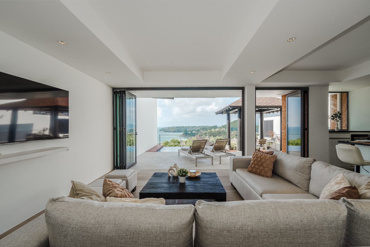 En lyxig villa vid stranden med två sängar med privat pool och fantastisk havsutsikt över Chalong Bay och öarna utanför kusten. Den tvåvåningsvilla ligger inom en resort och är inredda till högsta standard med egen pool och direkt tillgång till stranden. Städning ingår, byte av sängkläder och handdukar, wifi och Smart TV. Gästerna har gratis tillgång till resortens gemensamma pool och gym.