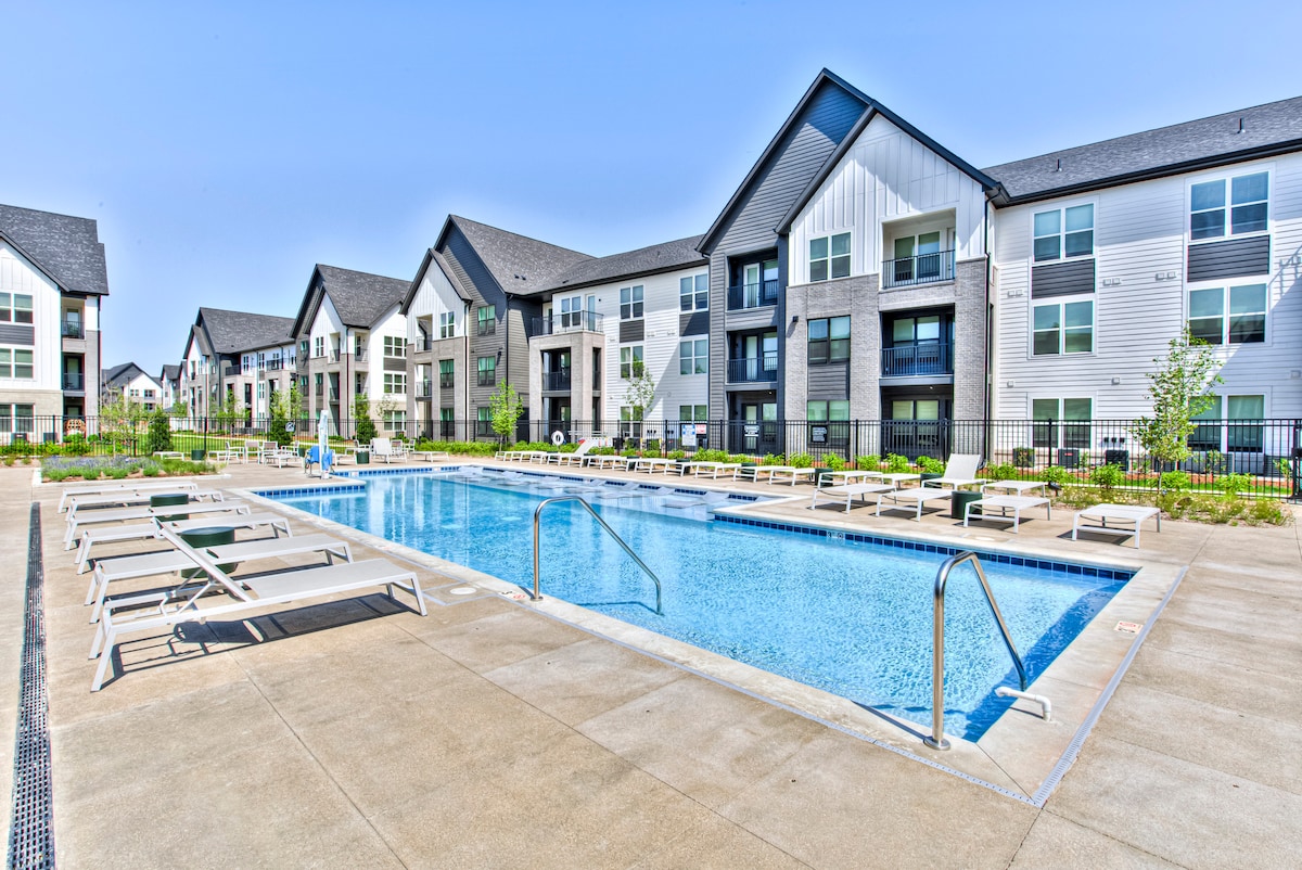 HELT NY exklusiv lägenhet med ett sovrum med dubbelsäng. Några minuter från Downtown Fishers. Komplexet är bekvämt beläget bredvid naturreservat, promenadväg och Nickel Plate Trail. Njut av de fantastiska bekvämligheterna: Pool, bubbelbad, fitnesscenter, affärscenter, klubbhus lounge & utomhus grillplats. 10 minuter från Ruoff Music Center. Obs: POOL OCH BUBBELPOOL ÄR ENDAST UNDER SOMMARMÅNADERNA. (FRÅN MEMORIAL DAY TILL LABOR DAY)