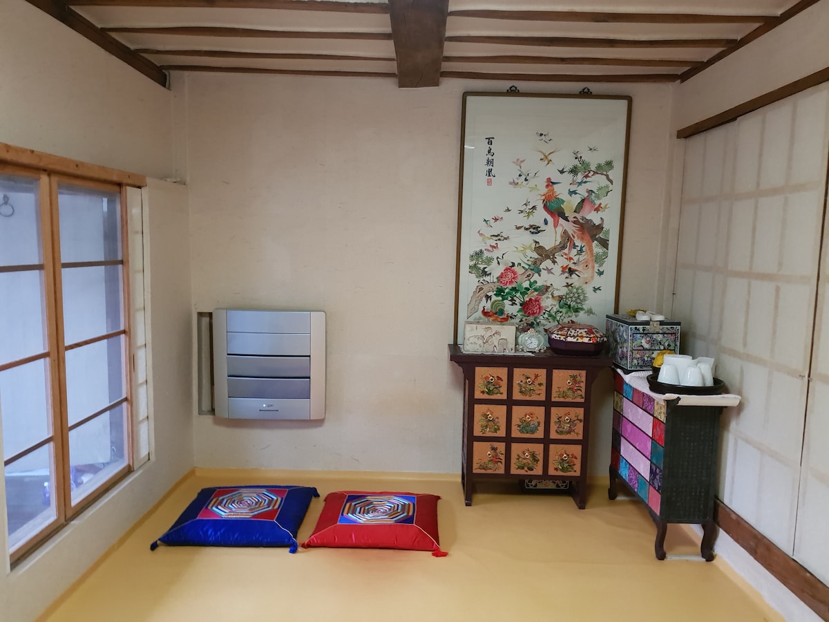 Som det är, känsligheten hos ett hanokkafé... Deokyongjae 4.9 är ett 120 år gammalt Hanok-hus som är på väg att registreras som kulturarv. Vi bevarar den cirkulära formen på ett traditionellt kakelhanokhus så mycket som möjligt. På det gamla sättet, när du tänder agung, insisterar du på att värma. Traditionella koreanska täcken såsom rent tvättad bomullsull tillhandahålls. På grund av hanoks natur är den sårbar för brand. På grund av detta är matlagning i köket i huset strängt förbjudet för brandförebyggande. (Enkel matlagning är dock möjlig med värdens tillstånd) På grund av villans karaktär kan det vara lite obekvämt till skillnad från ett hanokhotell eller en modern renoverad hanok. Vi kommer att bo i dörrhuset där värden är separerad, och vi kommer att tillhandahålla den bästa servicen så att det inte uppstår några olägenheter för gäster. Vad sägs om att göra en resa till det förflutna och läka i ditt eget privata utrymme omgiven av ett 800-pyeong kakel och stenstaket. Vi tillhandahåller grundläggande grillverktyg utan kostnad.