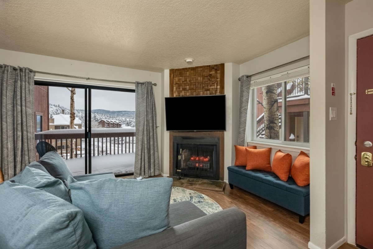 Du kan inte komma närmare det som händer än denna lägenhet. Perfekt beläget ovanför Angel Fire Resorts basområde, kommer du att ha första raden sittplatser för alla aktiviteter. Det här stället kan inte överträffas! Inuti hittar du en lägenhet med ett sovrum, ett vardagsrum med lädermöbler och en vacker staplad vedeldad öppen spis i sten. Vardagsrummet och sovrummet har ett stort fönster som släpper in den fantastiska bergsutsikten! Du kan åka skidor ut direkt på backarna ner till den första stolsliften!