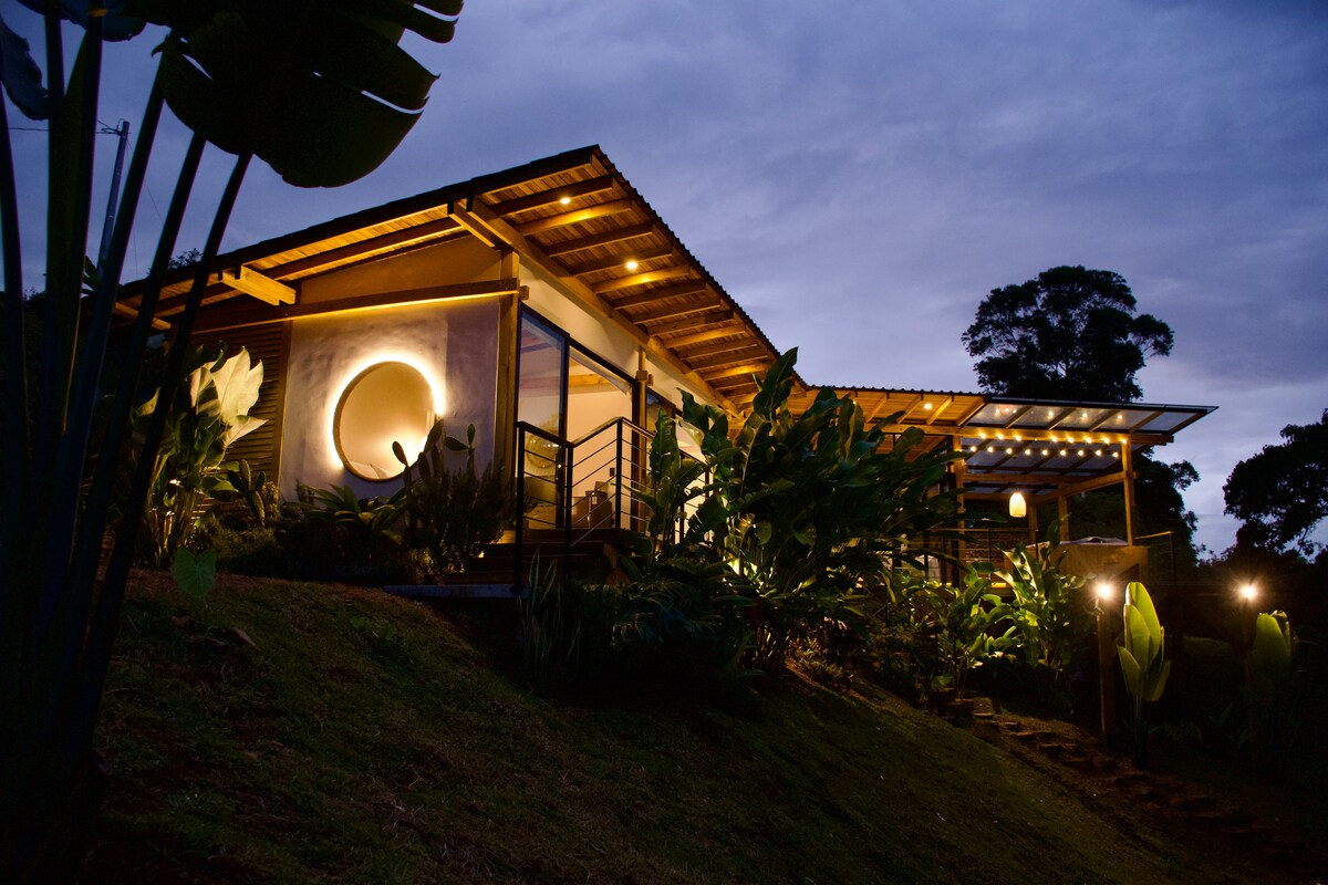 Ett minihus på en bergssluttning med utsikt över bergen och Pereira, beläget i fastigheten av en 100+ år typisk hacienda. Njut av de vackra trädgårdarna och mångfärgade fåglar, ta en kort promenad ner till en bäck omgiven av regnskog, eller bara koppla av i detta naturparadis efter en dag med sightseeing. Strategiskt beläget mellan Pereira och Armenien, bara 15 km från ikoniska Salento och 7,3 km från Filandia. Höjd: 1 800 m Genomsnittligt väder 68f/20c.