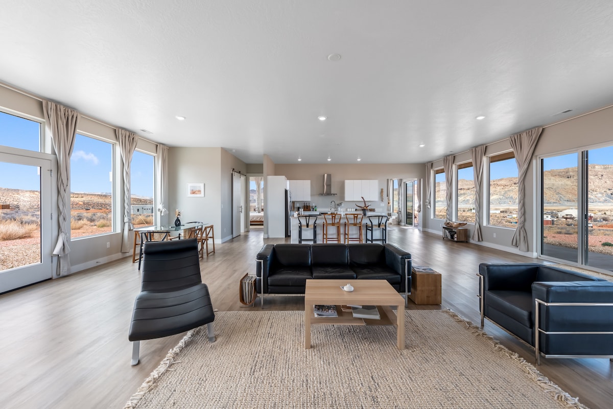 Ren, modern och rymlig retreat för att koppla av som ligger bara 8 minuter från Horseshoe Bend och 11 minuter från Antelope Canyon. Kom och njut av lyxen i hemmet och varva ner i vårt kurerade utrymme mellan dina öken- och sjöäventyr. Grilla och sitt runt eldstaden vid solnedgången, njut av utsikten över öknen och titta på stjärnorna innan du går in för att titta på en 75-tums HDTV, spela arkadspel, fotboll eller bordtennis. 3 minuters bilresa till stormarknader och alla de viktigaste restaurangerna i centrum. Snabbt WiFi, tvättmaskin/torktumlare, parkering