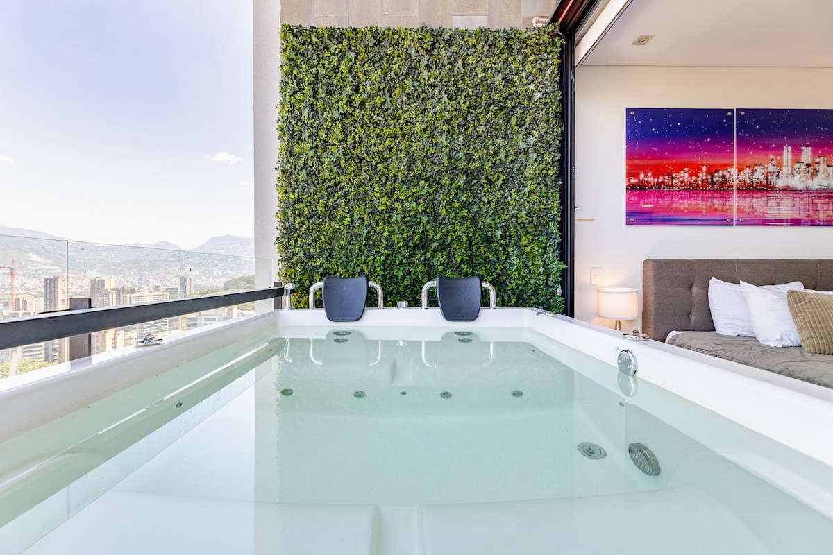 Lyxigt vindsvåning på 70 m² på 9:e våningen i ikoniska Energy Living. Öppna våra fönster från golv till tak för att förvandla hela ditt boende till en luftig tillflyktsplats under bar himmel med Medellins bästa utsikt över stadssilhuetten. Har en kingsize-säng, två 80-tums TV-apparater och en elegant, modern design. Njut av en oändlighetspool på taket, gym och jacuzzi på 22:a våningen. Beläget 5 minuter från Provenza och El Tesoro. Säkert, lugnt och med perfekta förbindelser.