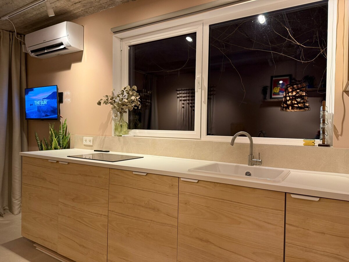 Koppla av och varva ner i denna fridfulla, eleganta gästsvit. Utrymmet utstrålar lugn och enkelhet, med en minimalistisk design, mjuka färger och utsikt över en grön uteplats. Det finns kylskåp och möjlighet att göra kaffe eller te. Sviten har eget badrum och ett litet utomhusutrymme för att njuta av tystnaden. Beläget nära söder och bara 15 minuters promenad från stadens centrum — perfekt för dig som älskar ljus, lugn och tidlös design.