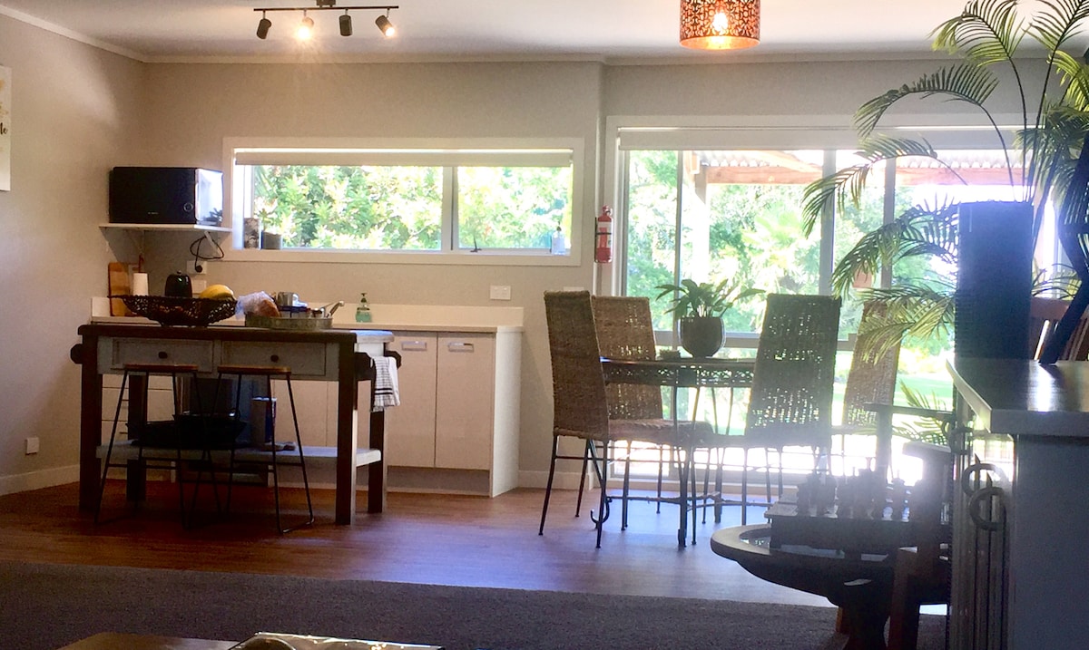 Ett modernt litet hem med egen parkering och ingång utanför gatan. Detta lilla hem ligger på baksidan av ett bostadshus och har en egen spapool med utomhusbelysning för att accentera de omgivande tropiska växterna. Omokoroa har ett överflöd av gång- och cykelvägar och detta boende ligger precis intill natursköna vandringsleder med utsikt över hamnen. 4 minuters bilresa från stormarknaden, barer och restauranger, golfbanan och 7 minuters bilresa till huvudstranden och bekvämligheter. Ingen städavgift.