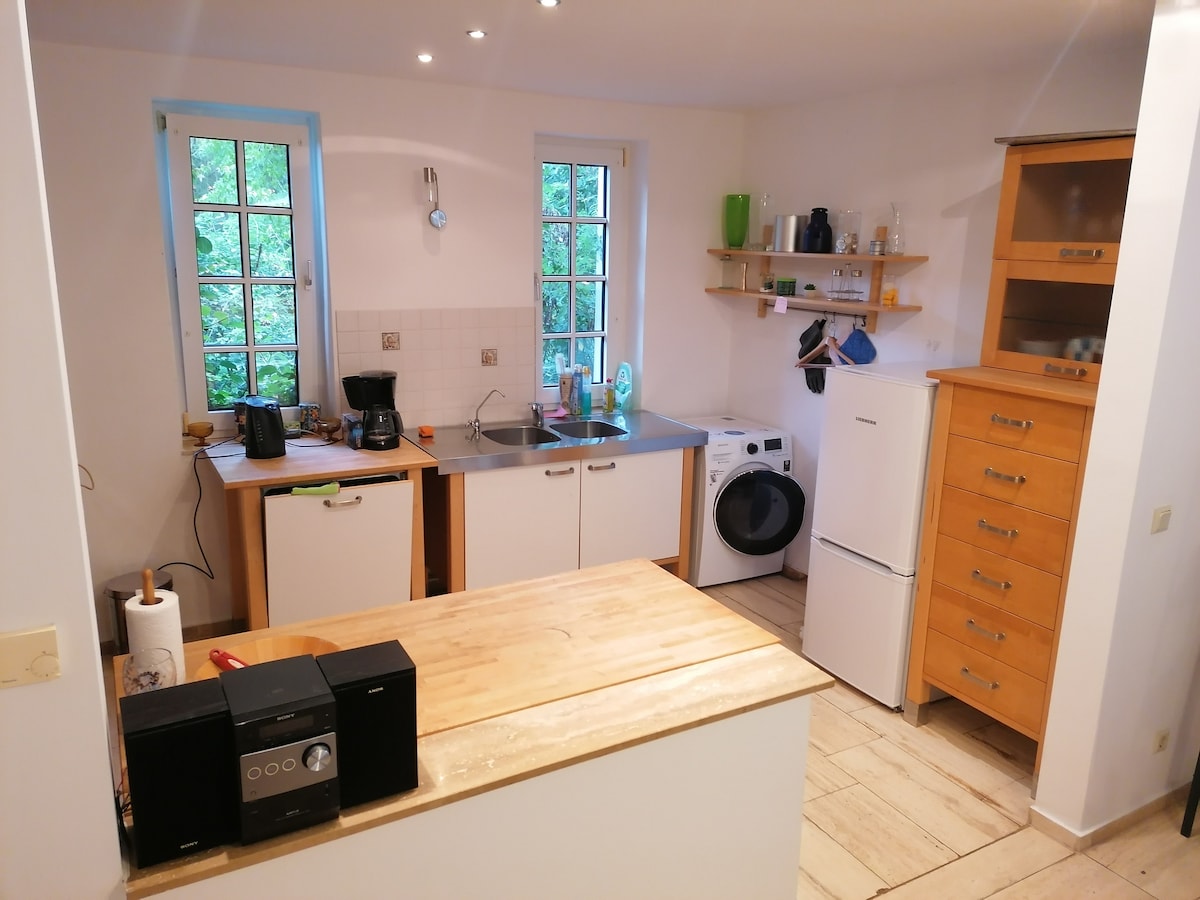För Landesgartenschau 2026 kommer du att bo hos oss på landsbygden och bara 10 minuter bort. Mitt i bäckar, biotop och ängar med gamla träd finns en lugnt belägen och modern restaurerad kvarnfastighet i Bauhausstil med närhet till stan. Det ljusa 90 kvm stora vardagsrummet ligger intill en stor takterrass, vilket ger en storslagen utsikt och inbjuder dig att koppla av. Den historiska kvarnkällaren har omvandlats till ett spa med bastu, bubbelpool, solstolar och öppen spis
