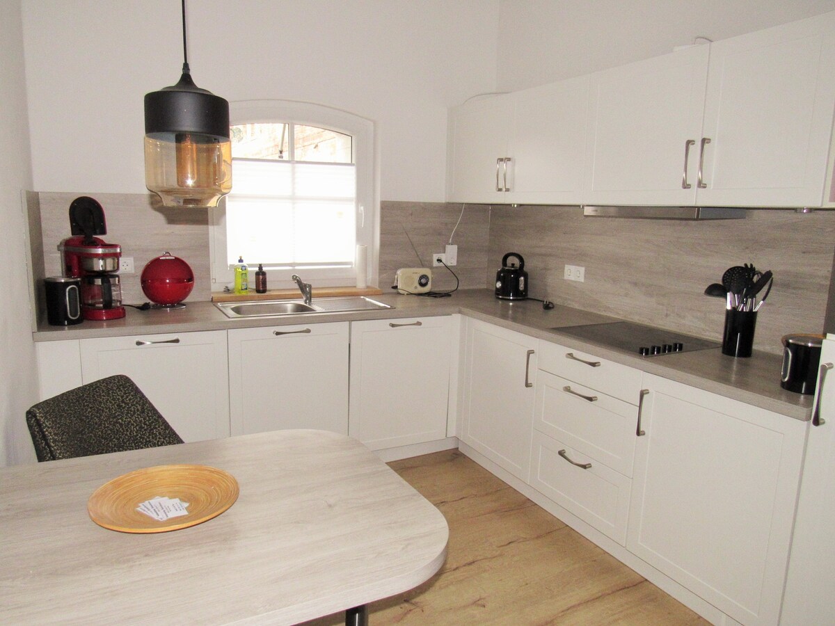 År 2025 renoverad 2-rumslägenhet för max. 3 personer plus småbarn i extrasängar. Här finns en dubbelsäng (180 x 200 cm / 71 x 78 tum), en bäddsoffa, ett fullt utrustat kök, ett modernt badrum och en egen ingång. Det lugna läget i närheten av A2 är perfekt för vandring, cyklister och geocaching-fans. Den perfekta basen för oförglömliga äventyr i omgivningarna. En laddningsanläggning för elcyklar är också möjlig. Perfekt för aktiv återhämtning och avkopplande dagar!