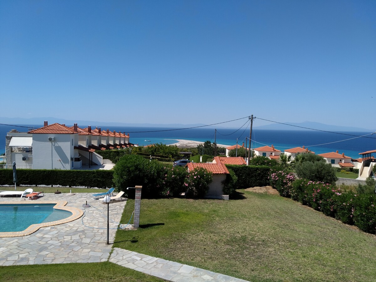 Viktigt: Anläggningen har en gemensam pool, men den är inte tillgänglig för Airbnb-gäster och kan inte användas under din vistelse. Boendet erbjuder en stor privat trädgård och flera utomhusområden för avkoppling. Beläget i Possidi, Halkidiki, bara 2 minuter med bil från stranden. Villan har 3 sovrum, ett vardagsrum med en bekväm bäddsoffa för två, ett fullt utrustat kök, 2 badrum och 1 toalett. Perfekt för familjer eller grupper som vill koppla av vid havet. Två parkeringsplatser ingår.