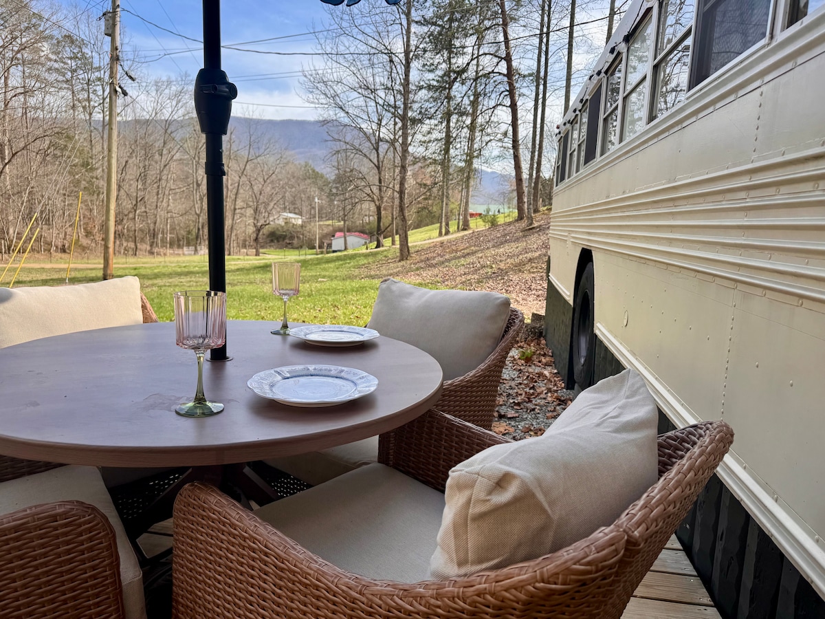 Folk, bussen går, hämta er biljett nu! Koppla av på vår enorma altan även i regnet. Titta på Netflix på vår smart-TV under bergen eller få din morgonjava att titta ut över vår fridfulla utsikt. Detta var en skolbuss, leta efter gul färg, nu är det en fantastisk reträtt med allt du behöver för en vistelse i vår (a) Blue Ridge Mountain(s) buss. Njut av att laga marshmallows i vår eldstad eller grilla ute på en lat eftermiddag. Kör längs den natursköna East Fork-floden bara 1000 meter bort. FÖRYNGRAS..