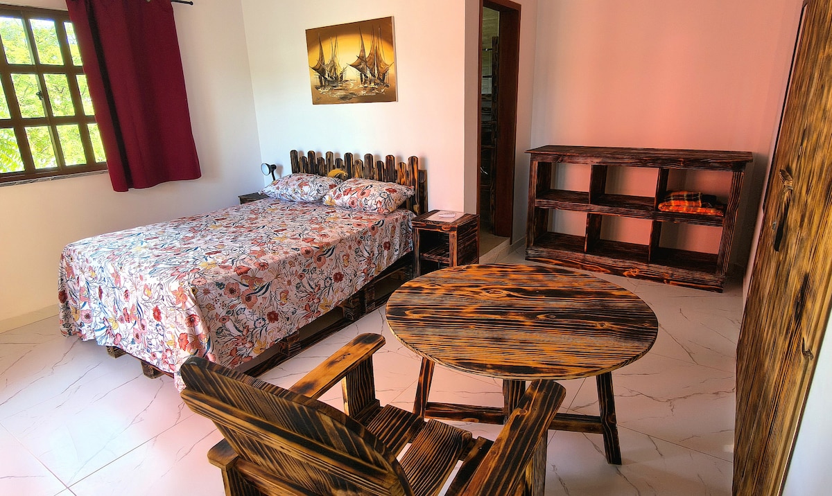 Ta det lugnt på denna unika och lugna tillflyktsort. Vakna i en vacker trädgård med en orkester av fågelljud och havsbrisen som blåser förbi och gör att du känner dig ett med naturen. Att njuta av från din egen veranda. Din alpstuga har havsutsikt. När du har promenerat genom de majestätiska falésias-klipporna är du på stranden efter 5 minuters promenad. Canoa Quebrada är en grotta full av charm, och en livlig gata med butiker och restauranger ligger runt hörnet. Du gör din egen frukost, kaffe serveras för dig.