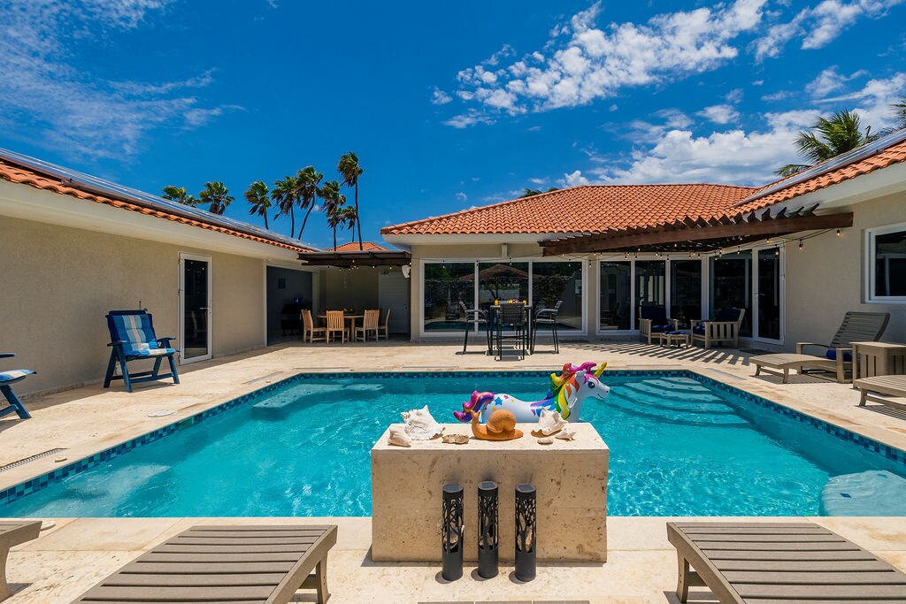 Are you looking for the ideal villa with private pool and just a 3 minute drive to the best beaches in the world? Don't look further and welcome to Blue Villa! Blue Villa is a 1500 sq. ft. modern home designed as the perfect vacation retreat. This 2 bedroom/2 bathroom villa with private pool and large garden is located only a 3 minute drive from Palm Beach and close to the best restaurants and casinos. Escaping cold weather for a longer period? Multiple months rent is also possible.