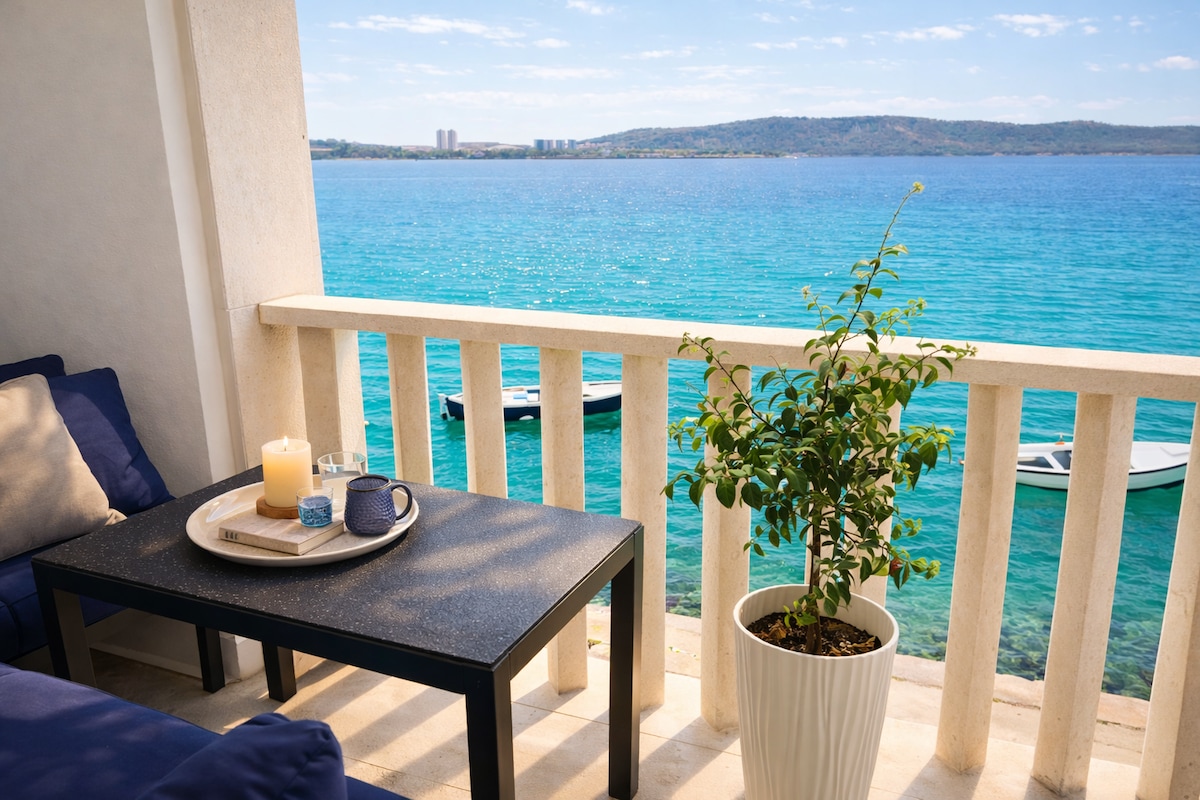 Mysig studio med fantastisk havsutsikt. Denna lilla men fullt utrustade studio ligger vid stranden, bara 2 km från Trogir, och är en utmärkt bas för din semester i centrala Dalmatien. En vacker stenstrand ligger tvärs över gatan — bara några steg bort. Terrassen delas mellan två studior, med ett utsett område framför varje för privat bruk. Observera att under högsäsong kan gatuparkering vara svår att hitta, även längre bort från huset.