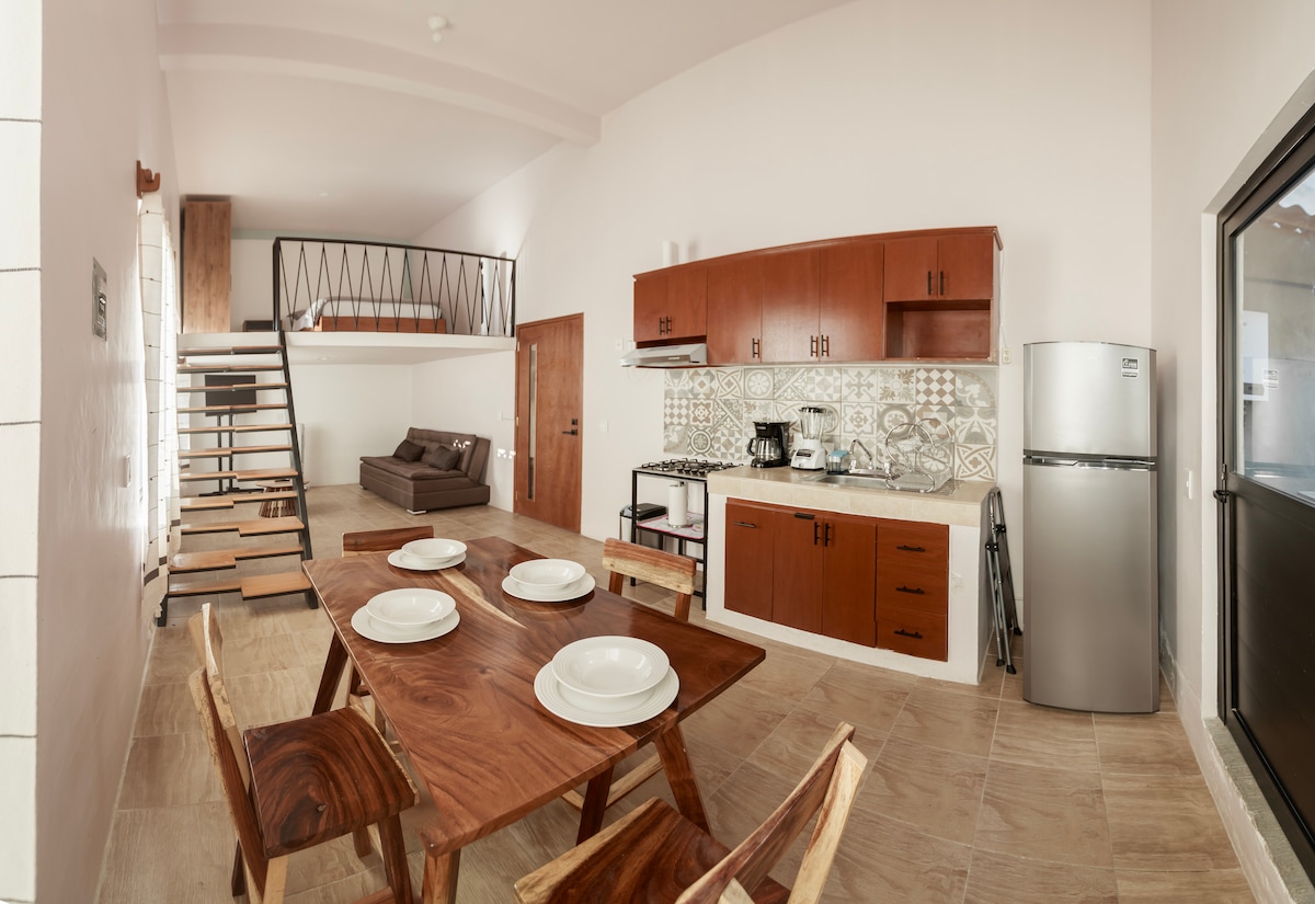 Descubre este encantador loft, ideal para una estancia relajante y confortable. Ofrece un ambiente cálido y contemporáneo, el espacio es luminoso y bien distribuido La planta baja cuenta con una sala de estar equipada con un sofá cama. Una escalera de madera y metal conduce a un entrepiso donde se encuentra una cama doble. La cocina funcional y bien equipada cuenta con una mesa de comedor de madera con cuatro sillas, perfecta para disfrutar de tus comidas.