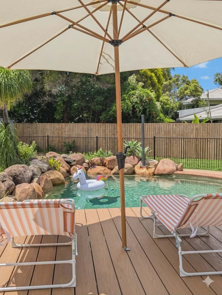 Detta stora 2 våningar stora semesterhus har allt. Stor nog för 2 eller fler familjer att semestra tillsammans och dela kostnaden (max 14 sovplatser). Annars gott om utrymme för mindre grupper att sprida ut sig och njuta av med 5 sovrum, 3 badrum och 2 kök. Det finns en bra stor pool eller så är det bara en kort promenad till den lokala stranden. Om du inte känner för att laga mat kan du gå ner till den lokala baren för en biff och några öl eller vad du än vill ha. Njut och koppla av på Magnetic Island.