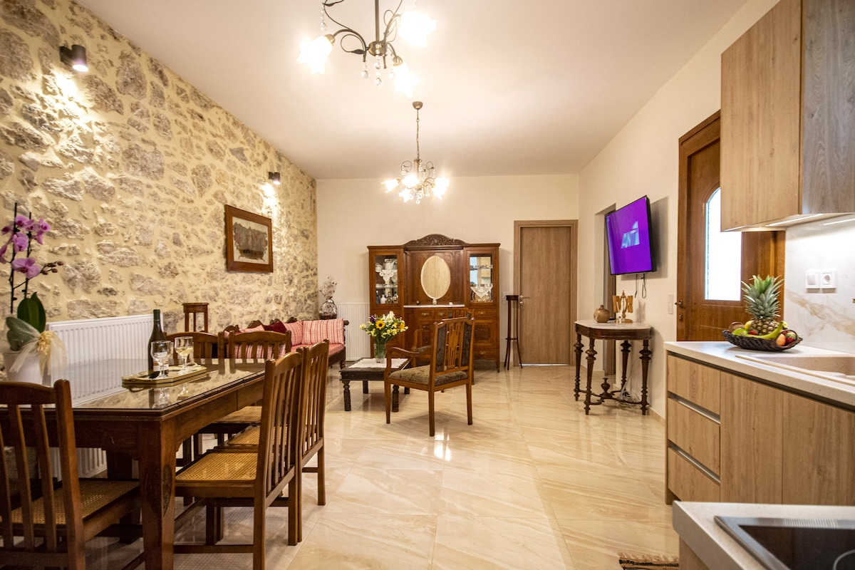 lyxigt renoverad traditionell tvåvånings, 175 kvm exklusive uteplats och terrass på första våningen. 70 % stenbyggd mycket bekvämt, lugnt, privat passar för par eller familjer mildare temperaturer även under sommarens värmeböljor beläget i Archanes (gammalt grannskap) känt för sin skönhet och historia idealisk plats i centrala Kreta, 10 minuter från motorvägen som leder till Heraklion och de stora stränderna i norr eller till södra Kreta ta en titt på omdömena