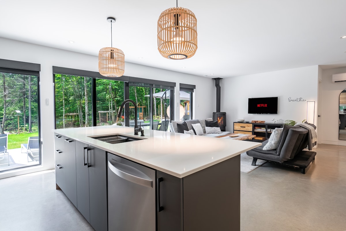(CITQ #301525 upphör 2026-09-30) Upptäck den varma och välkomnande atmosfären i Chalet Inukchic. Mjuk och unik inredning, riklig fenestration, fridfull utsikt över skogen... en destination för dem som älskar naturen och lugnet. Våra vandrings-/mountainbikeleder är tillgängliga direkt från stugan. Vår vackra terrass, högt uppe, är stället perfekt för dina sommarkvällar med vänner eller dina söta morgnar i lugn och ro.
