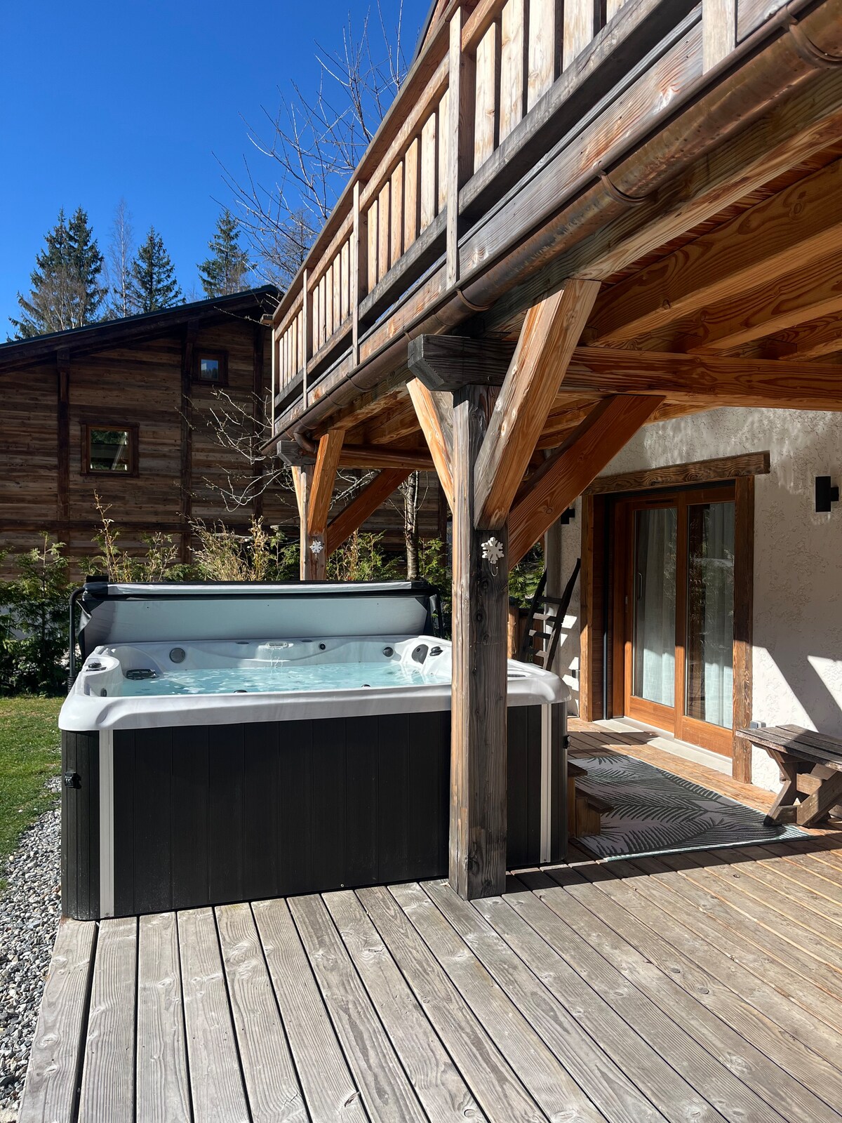 Lägg ved i en öppen spis med en massiv steneldstad och luta dig tillbaka på en rustik träsittbänk. Titta genom stora fönster på den alpina skogen som omger en autentisk stuga. Återvänd från backarna och varva ner i en lyxig bastu i ett elegant stugbadrum. Ett 25 m2 stort rum med dubbelsäng, förvaring, autentisk garderob. Ett varmt och rymligt vardagsrum med dubbla fönster med utsikt över Mont Blanc och öppen spis. Och en bänksoffa som kan omvandlas till 2 enkelsängar. Praktiskt och fullt utrustat kök. Ett granitbadrum med dusch och bastu för 3 personer. En terrass framför skogen och bäcken (med ofta besök av rådjur - se bilder), med fontän och fantastisk utsikt över Mont Blanc. Stugan är en individuell byggnad som är fullt tillgänglig och reserverad för gästerna. Det är även terrassen och omgivningen (en liten flod, en privat bro och tillgång till skogen). Tillgänglig för alla frågor. I byn Coupeau: Autentisk stuga i skogen ovanför Les Houches med enastående utsikt över Mont Blanc. Vid kanten av en liten fors med rådjur 5 minuter med bil från Les Houches, 10 minuter från Chamonix, 1 timme från Genève. Lätt tillgång via väg till stugan. 2 km från Les Houches och 10 km från Chamonix. Parkering precis bakom stugan En helt renoverad gammal stuga. Med all modern komfort (inklusive bastu för 3) och toppdekoration. En unik utsikt över Mont Blanc-kedjan. Stugan ligger i byn Coupeau, i skogen ovanför Les Houches, med enastående utsikt över Mont Blanc. Det är 5 minuters bilresa till Les Houches, 10 minuter till Chamonix och en timme till Genève.