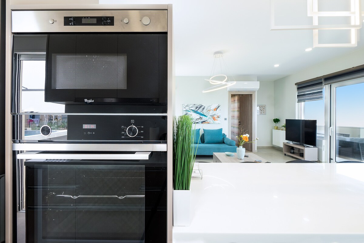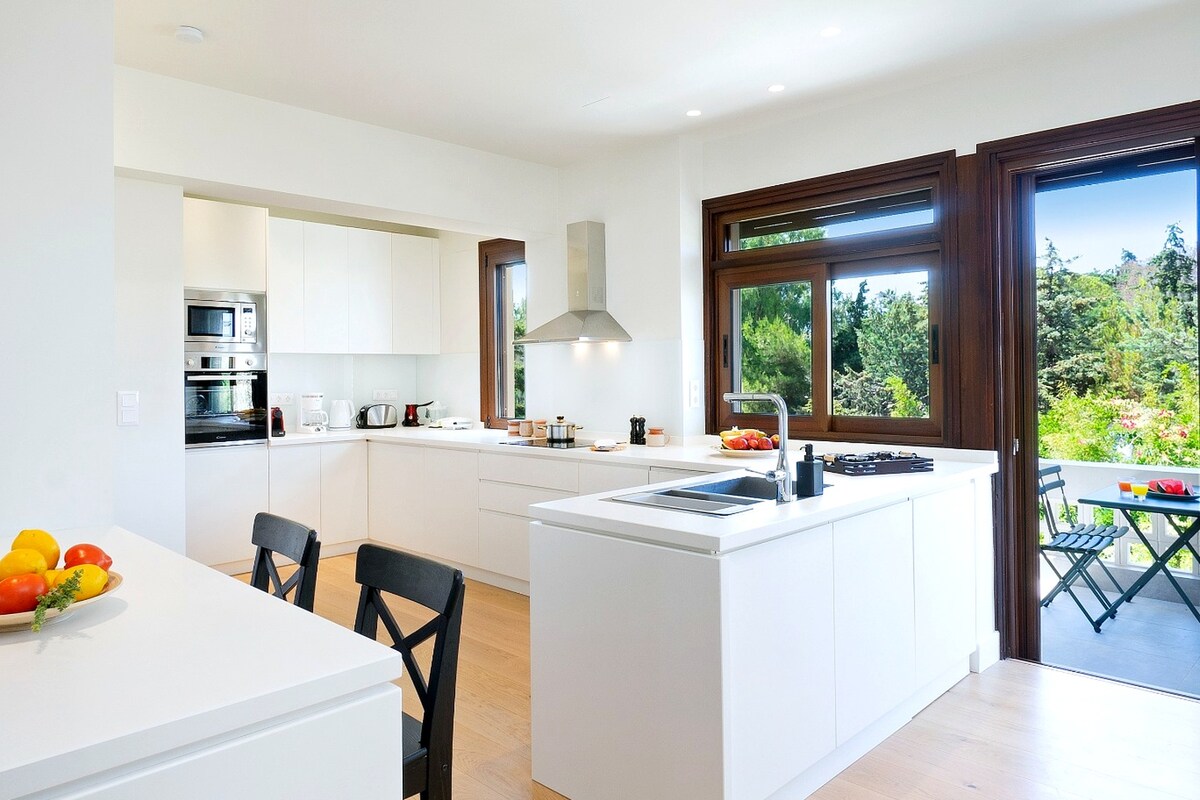 Pachnes har 4 lyxlägenheter: Pi (6 gäster), Alpha (4 gäster), Chi (4 gäster) och Ni (2 gäster). Detta är Alpha med en dubbelsäng i 1 sovrum, en dubbelsäng på vinden, stora fönster, mörkläggningspersienner, verandor och terrass med stadsskyline och naturliga landskap. Den moderna designen inkluderar toppmoderna apparater. Njut av ett fullt utrustat kök med kylskåp, ugn, mikrovågsugn och kaffebryggare. Boendet erbjuder en stor gemensam pool och en baby pool för de fyra lägenheterna.
