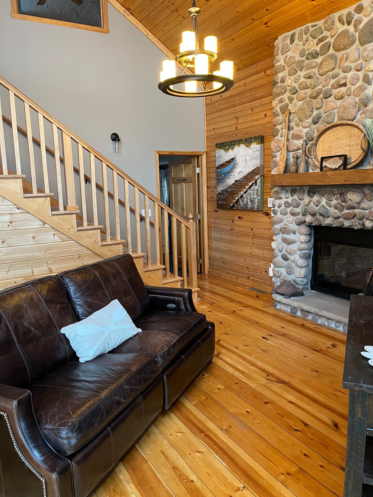 *If you have pets, please inquire before booking* Your own private secluded waterfront log cabin with a sandy beach to play or relax while sitting around the of fire-pit. Fish from shore or play one of the many outdoor games including Cornhole Toss, or Darts. This 3 bedroom 1 bathroom location has it all; even drive your ATV/Snowmobile from the cabin to trails. This beautiful cabin has all rustic decor but modern conveniences with a private gated driveway on private acres.