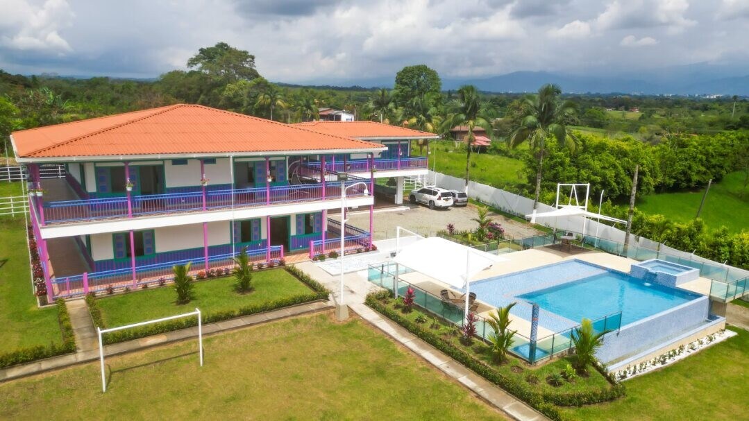 Njut av kaffeaxeln när det är som bäst, vårt hus har 5 bekväma rum vardera med eget badrum, 2 TV-rum, fullt utrustat kök, kolgrill, gasolgrill, fat för stekar, pool, uppvärmd jacuzzi, fotbollsplan, etc. Vårt hus ligger i ett av de vackraste platserna i regionen bara 10 minuter från kaffe och panaca park, mycket nära staden Armenien och de viktigaste turistattraktionerna i avdelningen.