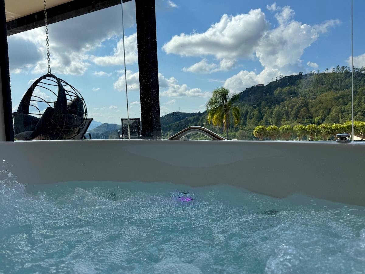 I media bergen i Serra Negra - SP, Dentro do Sítio Monte Belo. För avkoppling , med lyx och sofistikering bara 5 minuter från centrum. Räkna med: Utsikt 360 över bergen Eldstad, Luftkonditionerad simbassäng, Uppvärmt badkar med vattenmassage, Grillplats, 84”projektor Filmljud, Dusch p/ 2 med utsikt Lokalt kaffe för gratis provsmakning inne i stugan. Allt PRIVAT Imponera på din kärlek! Vi är Pet Friend-Ly. Vi accepterar inte barn