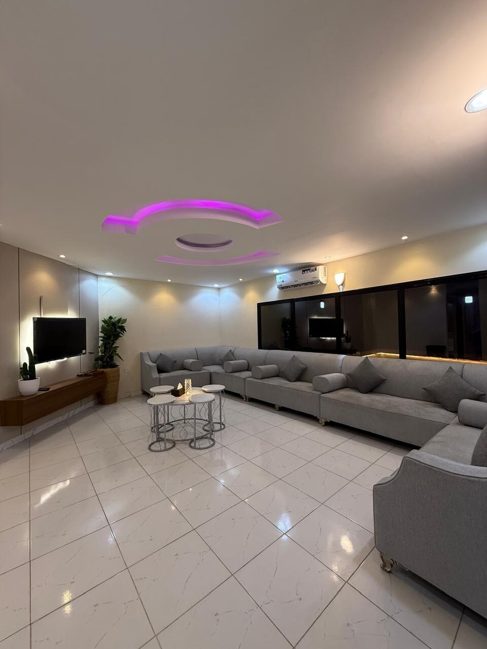 Relax with the whole family or friends at this 3-bedroom peaceful place to stay. Furnished patio & terrace with gas fire pit operational in winter, projection media room with Netflix, STCtv, Shahid vip tv, indoor heated swimming pool operational only in summer, two family rooms, full kitchen, washing machine, 4-full bathrooms, free 8-car parking, driver private room with kitchen & bathroom.