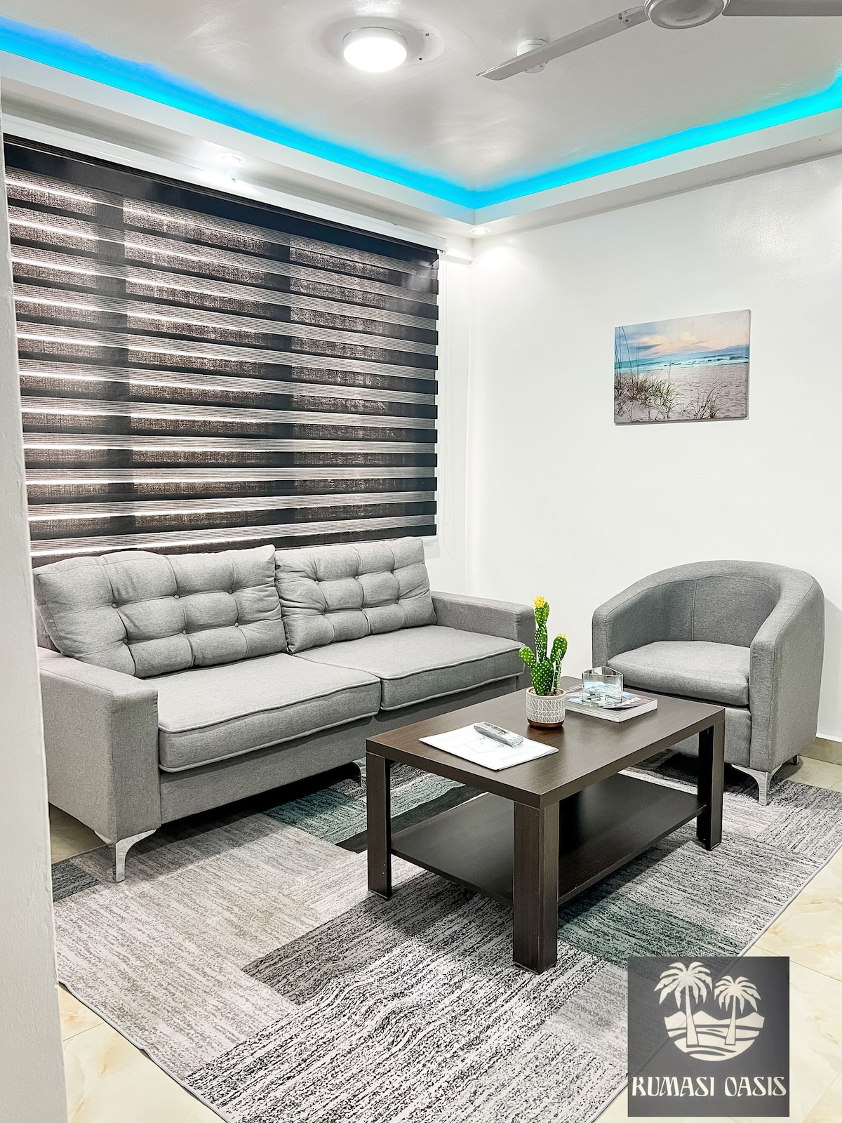 Mysig lägenhet med 2 sovrum i Serene Osei Tutu Estate, Kumasi Välkommen till ditt perfekta hem hemifrån! Denna eleganta tvårumslägenhet ligger i den fridfulla och säkra Osei Tutu Estate och erbjuder en varm, modern tillflyktsort i hjärtat av Kumasi. Oavsett om du reser i arbetet eller på fritiden kommer du att älska den lugna atmosfären, den smakfulla inredningen och de genomtänkta detaljerna som gör din vistelse extra bekväm.