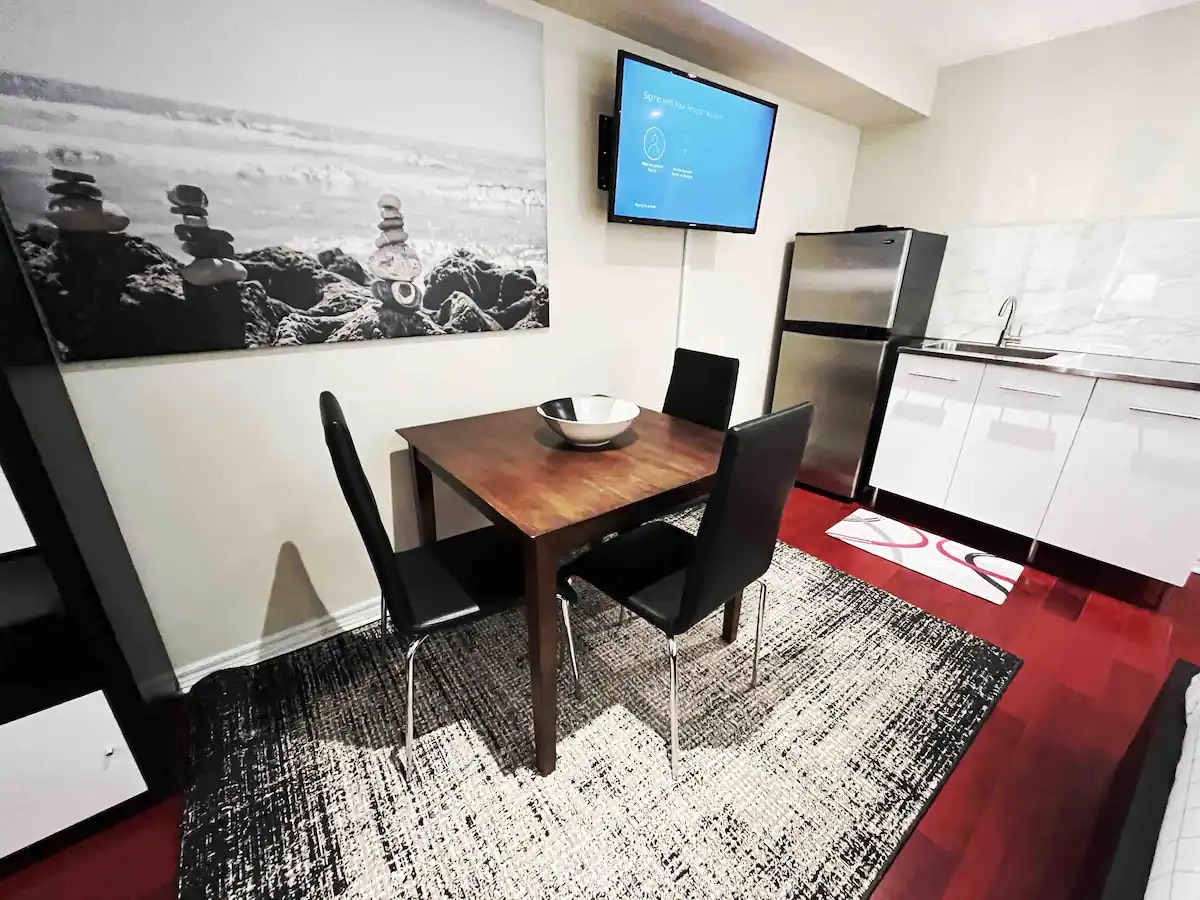 Nyrenoverad, rymlig källarsvit med ett sovrum. (soffan dras inte ut) Beläget på en lugn gata med en privat ingång. Queen Street East, Woodbine Beach, The Beaches grannskap & 2 - 24 timmars spårvagnar till centrum. 8'-2" tak, golvvärme, fullt utrustat kök, WIFI, NETFLIX Nyckelkod för enkelt tillträde. Vi bor på de övre våningarna och delar gärna med oss av eventuella insikter om staden om så önskas! Schampo/balsam, duschtvål, handdukar Gatuparkering — 20 dollar/24 timmar, 28 dollar/48 timmar, 42 dollar/vecka
