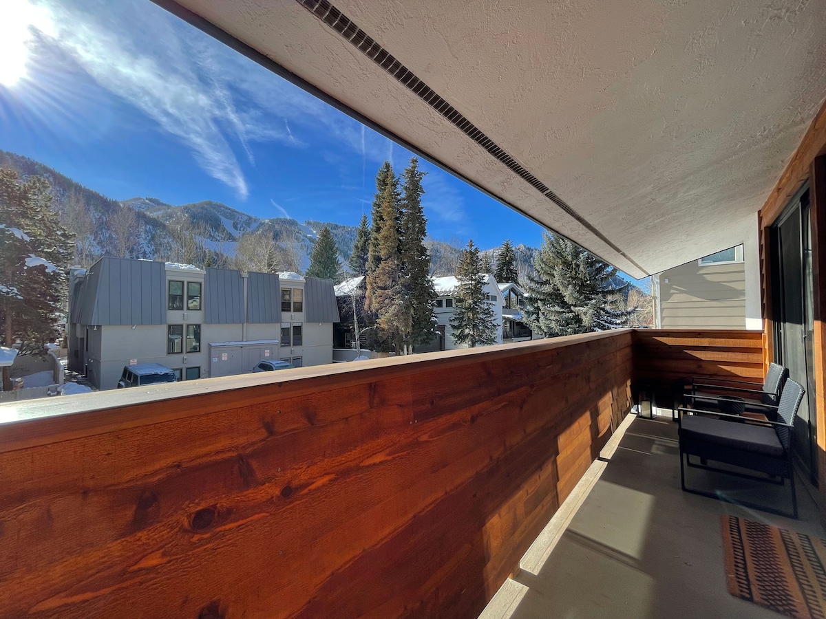 Nyrenoverad lägenhet på bottenvåningen, med ljust solrum och bergsutsikt. Komplexet har en tvättmaskin och torktumlare och är familjevänligt. Inget behov för bil, vi är en kort promenad från Aspen Mountain och de fantastiska restaurangerna, shopping och nattlivet som Aspen Village har att erbjuda! Du kommer att vara 500 meter från Ajax gondol, 3 kvarter från City Market livsmedelsbutik och vinbutik och 4 kvarter till Aspen Art Museum. Två sovrum med eget badrum + en utdragbar soffa