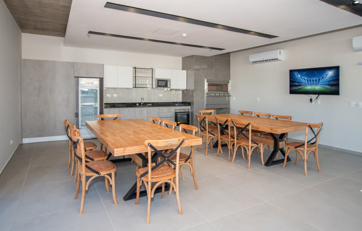 Modern lägenhet, superutrustad, med balkong, grill, panoramautsikt från 24:e våningen och utmärkta tjänster: - simbassäng - Coworking - Quincho - En biograf - Parkering vid självhiss (liten/medelstor bil) - Säkerhet dygnet runt Toppenområde: - 5 minuter från Corporate Axis, Shopping del Sol och Paseo La Galería. - 10 minuter från Costanera och Héroes del Chaco Bridge. - 15 minuter från Silvio Pettirossi International Airport. Inkluderar Wi-Fi · Smart-TV · Premium-madrasser