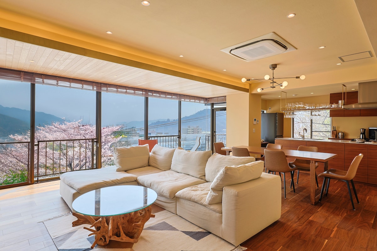 Ett modernt hus inbäddat högt upp en lite brant bergsväg från staden Minami Atami/Ajiro, där torkad mat är känd. När du går in kommer du att omslutas av dofterna av trä. Utsikten från fönstret, ca. 10 meter bred, är hisnande.Du kan njuta av nattutsikten över Atami och fyrverkerierna i ett modernt nordiskt rum med berömda möbler.På soliga dagar kan du också njuta av den bästa utsikten och stjärnhimlen från taket, och njuta av grillning. Badet är ett keramiskt bad som rymmer två personer, och det matas av källan Ajiro Onsen.Den höga temperaturen kalcium natriumklorid varma källan värmer dig från kärnan av din kropp och gör din hud slät. Första våningen är ett avkopplande sovrum.Vi har också futoner, så barnen kan sova gott.Det finns en väggmonterad TV och ett skrivbord. Det finns också en kort projektor, wifi, etc. på en stor skärm, vilket gör den idealisk för arbetsplatser!Vi rekommenderar också att du tittar på filmer och tar med en spelkonsol för en stor skärmspelsturnering. Det stora köket är fullt utrustat med matlagningsapparater och en tvättmaskin och torktumlare, så du kommer inte att ha några problem under långtidsvistelser. Det finns också bilderböcker för små barn och en barnbadbalja och en barnstol. Tillbringa en lyxig tid med utsikt över havet, eller använd det som bas för sightseeing i Atami och Izu.Ha en trevlig vistelse. ⭐ Taxi kan ordnas på utcheckningsdatumet
