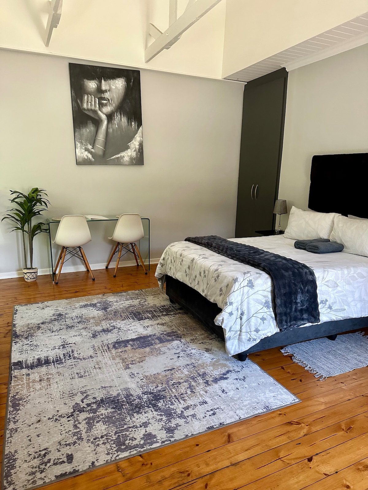 Large open plan bedroom with open truss ceilings, wooden floors and a large cupboard with kitchenette and bathroom which consists of a shower, toilet and basin. The unit uses a gas geyser. Wifi and tv run off an inverter during power outages. This unit is not equipped for cooking, but an air-fryer is provided. These units have wooden floors which some guests may find noisy.