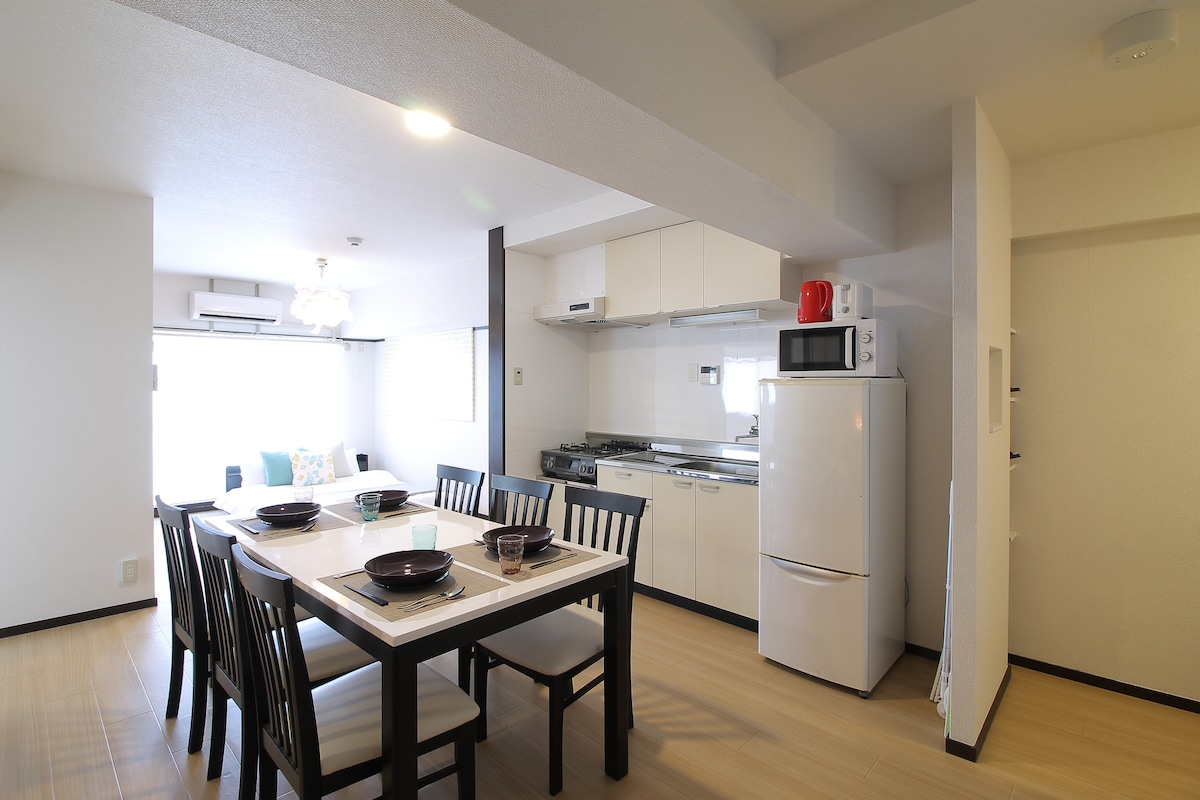 Stor lägenhet med 3 sovrum 4 minuters promenad till Peace Park. Det har matplats för att njuta av din måltid. Passar bekvämt 6 personer. Balkongen har en fin utsikt. Har ett eget kök komplett med grundläggande apparater. Separat modern toalett och bad med puderrumsområde. Hela utrymmet är ditt under din vistelse. Du kommer inte att dela detta med andra gäster. Ficka Wifi tillhandahålls. Tvättmaskin med torktumlarfunktion är gratis att använda och levereras med gratis tvättmedel. Perfekt läge i Hiroshima stad.