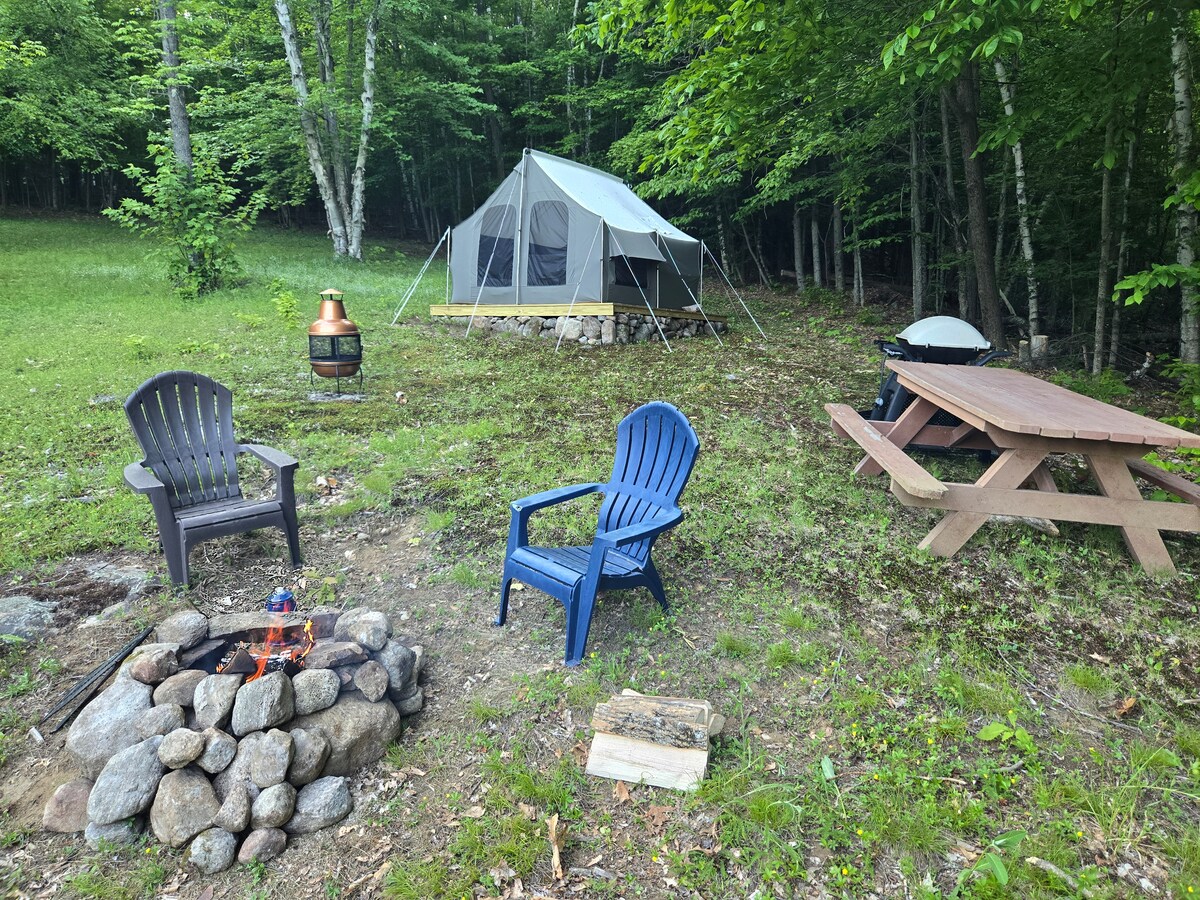 Vi erbjuder ett vackert, BEKVÄMT alternativ till camping. Vårt off grid-tält kommer med alla bekvämligheter hemifrån, inklusive en vedspis och läshörna! Det ligger inbäddat i en hemlocklund med utsikt över den aktiva bäverdammen. Vandringsleder och lokala aktiviteter på ett stenkast. Om du har en liten båt eller kajaker — TA MED dem! Vi har utrymme på gården och massor av lokala platser att skicka dig till för att få bra användning av dem. Använd inte på vår damm. Vi har en båt tillgänglig för användning.