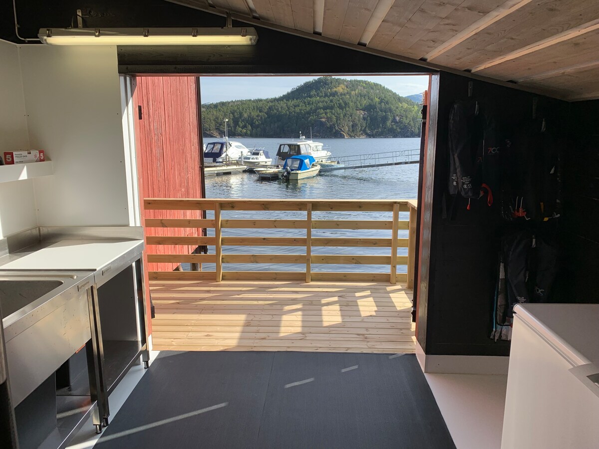 Huset byggdes 1899, men är nu helt renoverat med bevarandet av den gamla och kära. Huset har ett stort modernt kök med vinskåp och allt du behöver i ett utrustat kök. Ett vardagsrum med sittgrupp, matbord och öppen spis för lite extra komfort. Det finns två badrum i huset där ett badrum har ett badkar som glasyren på tårtan. På verandan finns en sittgrupp och vacker utsikt över fjorden. Huset är perfekt för en större familj, grupp vänner eller en företagsgrupp.