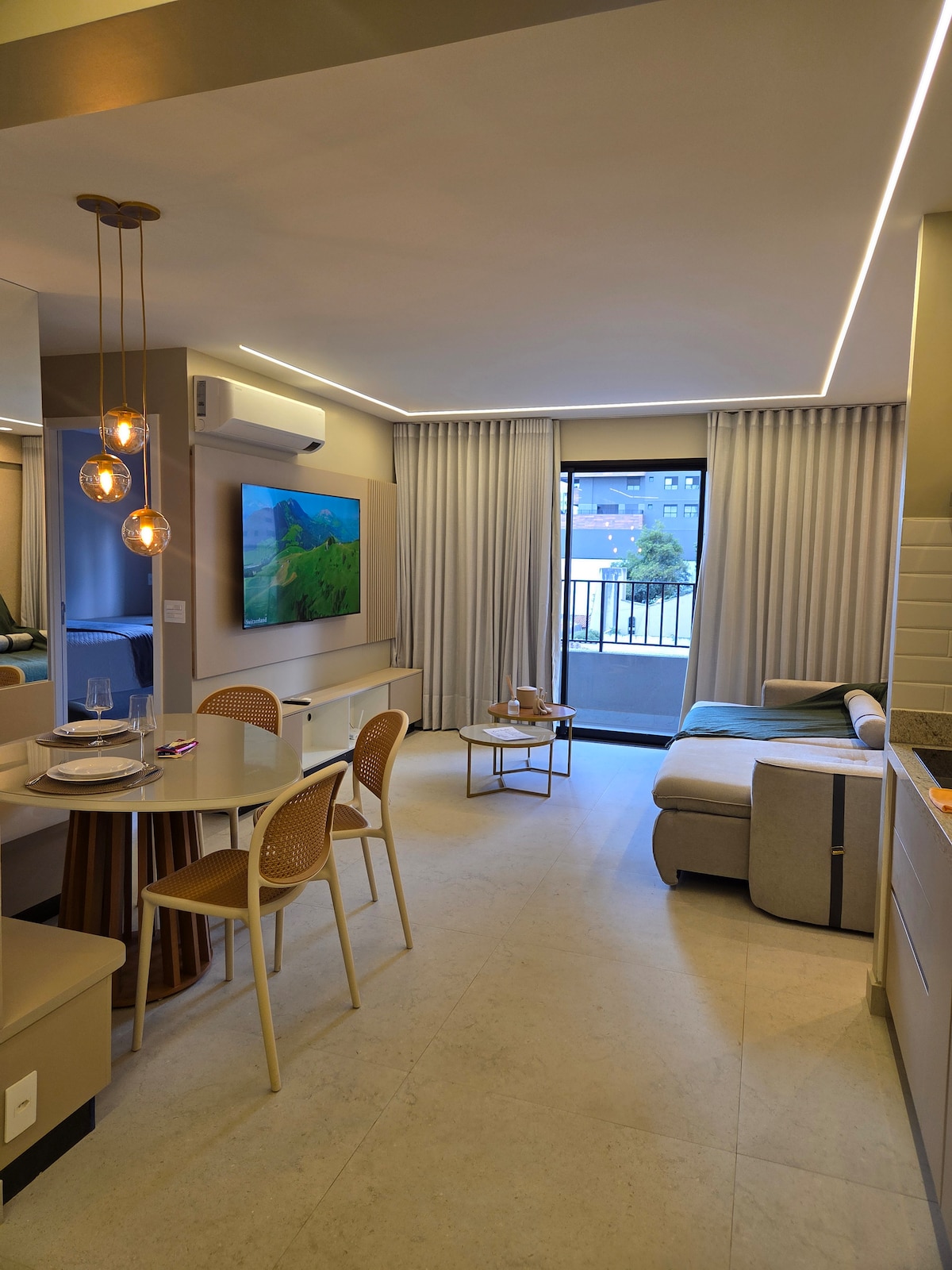 Viva uma experiência extraordinária e memorável se hospedando em um imóvel cheio de requinte, luxo e comodidade. Tecnologia se une ao conforto, podendo comandar o apartamento por comandos de voz dado a Alexa. O ambiente integra sala, cozinha e quarto de forma harmoniosa, com design contemporâneo, iluminação acolhedora e móveis de alto padrão. Aqui além de estilo e conforto, você tem tudo que precisa para se sentir em casa, mesmo estando longe dela.