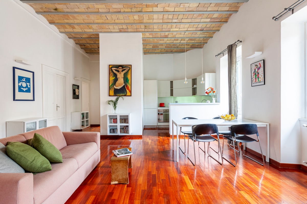 Ett nyrenoverat hus, där alla romare skulle vilja bo. Mellan kyrkan "Santa Cecilia" och "San Francesco a Ripa". Fördjupad i historia, på en stämning av frid och poesi. Låt dig bli överväldigad av hjärtat av Rom i en lägenhet där ljus och himlen regerar högsta, där du kan njuta av en hisnande utsikt över Aventino Hill och med en 2 minuters promenad, bland oförglömliga karakteristiska gränder, kan du nå alla attraktioner.