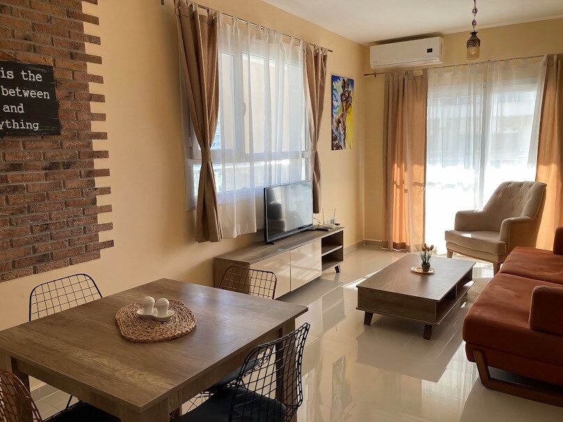 🌊 Boho-style apartment just 200 m from the sea & restaurants. Equipped kitchen, Netflix, A/C, and balcony. Free access to pool, sauna, hammam, gym, tennis court, playground & more. Supermarket is only 100 m away, open daily from 7:30 AM–10:30 PM. Perfect location for both relaxation & adventure—with nearby casinos and wild donkeys by the sea that walk beside your car. A truly unique stay awaits!