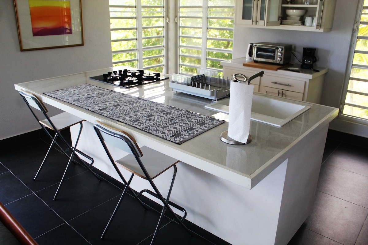 Vila, fräscha upp dig, återställ i denna moderna oas på sluttningen med frisk luft och naturligt ljus. Vakna till fågelsång eller somna in i månsken i vår luftiga öppna svit designad av Saint Lucias ledande poet/konstnär/producent Adrian Augier. Njut av en rymlig trädgård med bergsutsikt, havsutsikt, grindad ingång och utsedd parkering. Bekvämt till strand, shopping, flygplats, underhållning, kollektivtrafik. Begär städservice 3 gånger/vecka. Oslagbart värde!!!