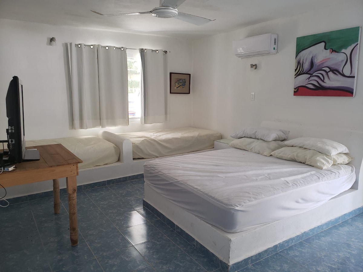 Det är ett bekvämt boende för gäster med tillgång till Laguna de Bacalar på 35 meter. Vi har inte lämplig TV.. Vi ligger 5,4 km från centrala Bacalar. Det finns en spis för att göra kaffe och en kylare för de uppfriskande drinkarna. Utrustad med 2 Queensize, AC, fläkt och eget badrum. Om det finns mobilsignal, WIFI (kan misslyckas). det finns extern taxitjänst.
