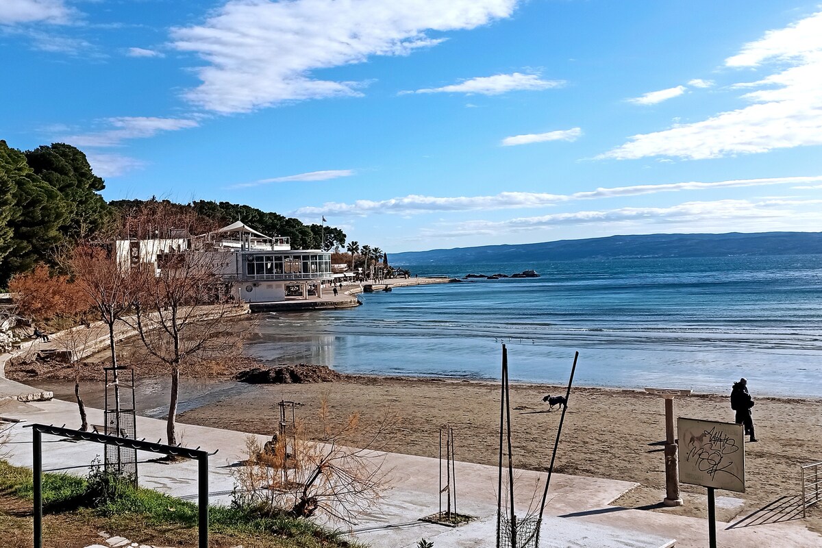 Vår stora lägenhet har två sovrum med dubbelsäng och två enkelsängar, stor garderob och förvaringsplats, stor balkong med vacker utsikt över havet, kök, badrum, TV, WIFI. Det finns en gratis parkering framför huset. Stranden ligger två minuters bilresa från huset. Split ligger 10 minuters bilresa från huset. Det finns många restauranger, sportinnehåll och alla andra aktiviteter som du kan tänka dig! Naturen runt huset är fantastisk och unik.