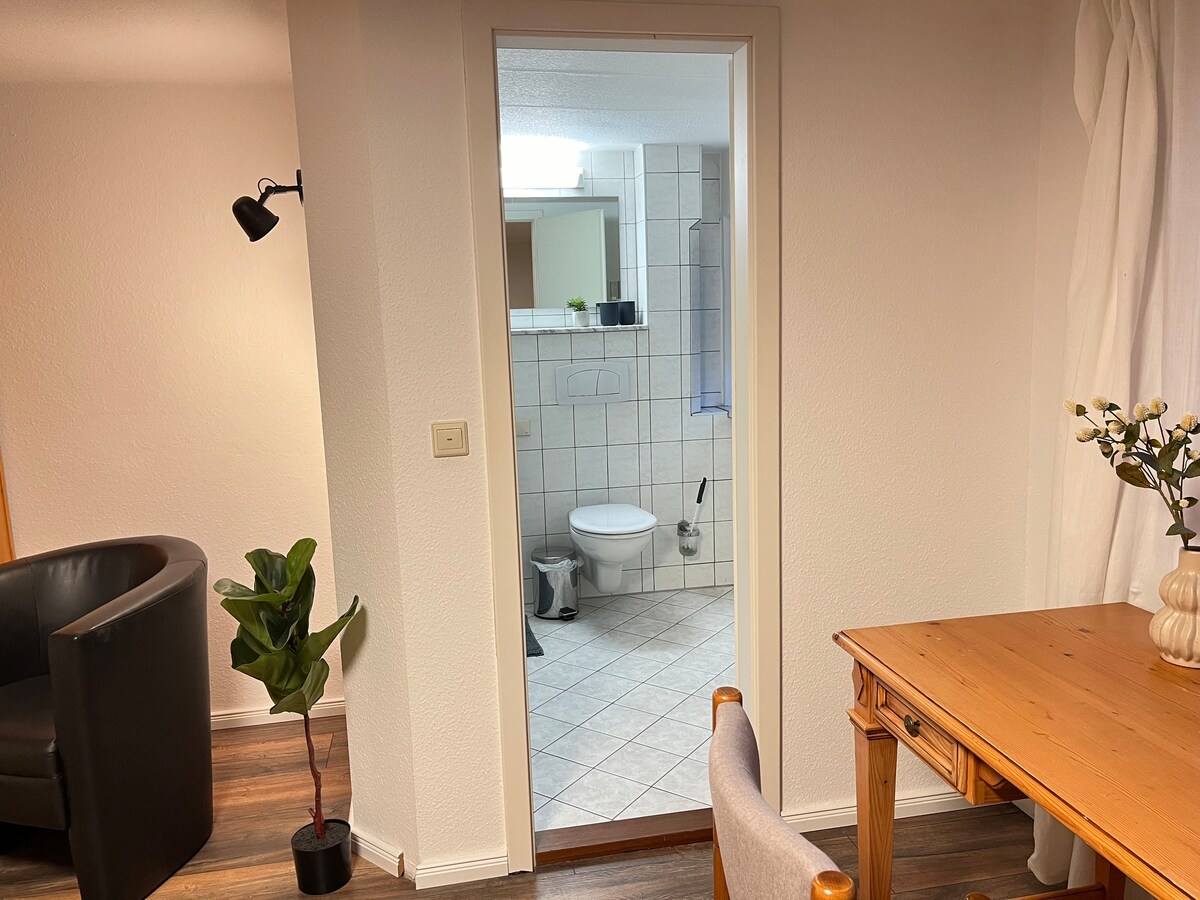 Mycket elegant 1-rumslägenhet (bäddsoffa!) med separat duschrum, 31 kvadratmeter stort vardagsrum, separat ingång och tillgång till Fasssauna, realiserad i samarbete mellan arkitekt, inredningsdesigner och möbeldesigner. Alla möbler är specialtillverkade, köksbänk och frukostbar i betong/träinlägg/epoxiharts. Duschrum med betongspackel, varigenom duschen och toaletten inte kunde separeras på grund av det mycket begränsade utrymmet.