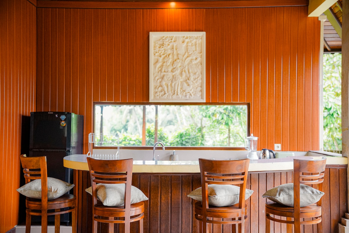 Denna villa är säkert belägen inom ett balinesiskt familjeområde och är rymlig. Balinesisk stil semiöppen fastighet. Här kan du njuta av absolut integritet, perfekt för din avkoppling. Ditt utrymme består av ett extra stort vardagsrum, pentrykök och matplats plus badrum allt på denna ena nivå. Ditt sovrum är rymligt och har en takfläkt samt luftkonditionering, öppningsfönster. Och en enorm dubbelsäng för dig att njuta av. Vänligen använd våra lokalt tillverkade batik kimonos under din vistelse