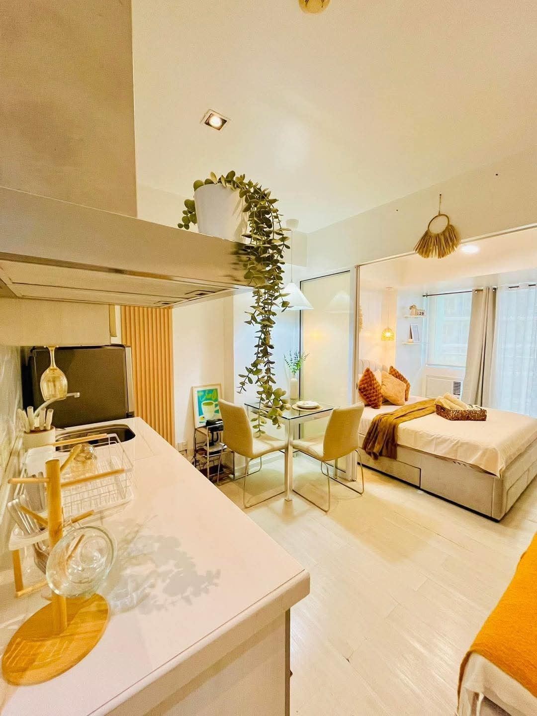 Läget är bara ett gångavstånd till SM Bicutan och det är bara 15 minuter från NAIA 1, 2 och 3. Priset är bra för 2 men ytterligare person är tillåten upp till 2 personer. Ett minimalistiskt ställe med en touch av naturen Ett bra ställe som erbjuder allt du behöver för en kort vistelse. Sov som om du är hemma. En atmosfär i hemmet är vad vi strävar efter, njut av din vistelse med dina nära och kära här. Vi erbjuder dig ett elegant, bekvämt rum, köksutrustning, med wifi och smart-TV för underhållning.
