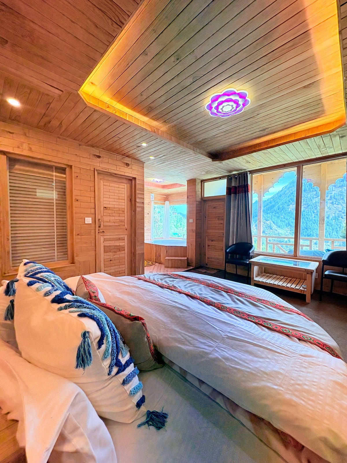 Vackert glashus i trä med jacuzzi och utsikt över dalen, centralt beläget nära marknaden, populära kaféer och ett vattenfall – perfekt för en fridfull semester. # Rymligt huvudsovrum # Privat jacuzzi med utsikt över dalen # Power Backup # Gratis Wi-Fi # Lägereldsplats # Matservice på boendet # Omgivet av natur # Gratis parkeringsplats Notera: - Det är 50 meters promenad från parkeringsplatsen till boendet. Vi hämtar ditt bagage. Frukost, måltider, rumsvärmare och lägereld ingår inte i vistelsepriset här